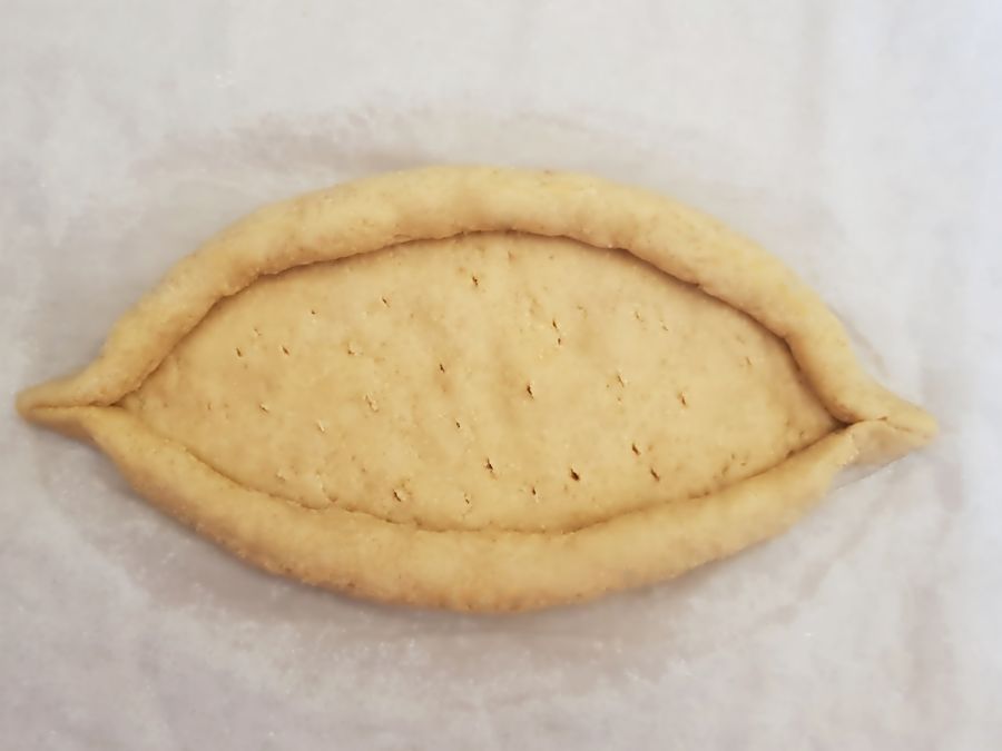 - Danach ein paar Minuten abkühlen lassen. Den Rand großzügig mit Ei bestreichen und mit Sesam bestreuen. Die Fülle auf beide Pide aufteilen und für weitere 25 Minuten bei 160 Grad fertig backen.