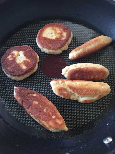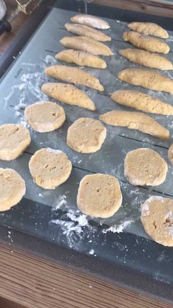 • Aus dem Teig auf mit Bambusfaser "bemehlter" Fläche und mit Bambusfaser"bemehlten" Händen eine Rolle machen, Stücke runterschneiden und "Fingernudeln" oder "Plätzchen " formen.