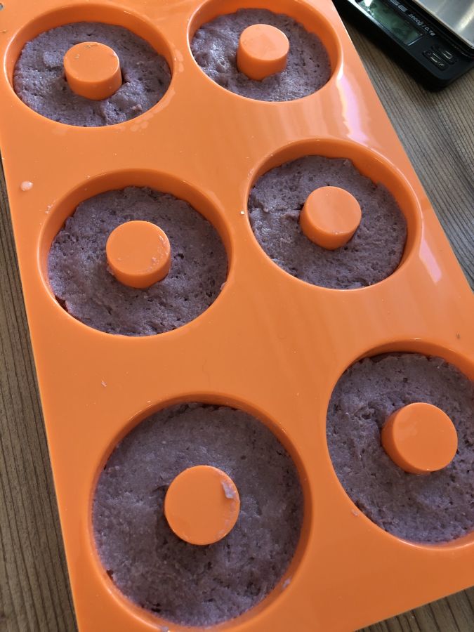 - Teig in einen Spritzbeutel mit großer Lochtülle füllen und in die Donuts Silikonform spritzen! Ich habe 6 Stück daraus gemacht.