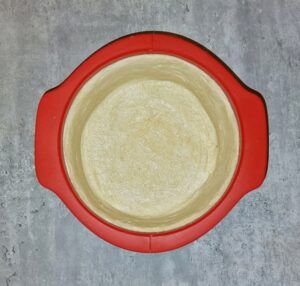 - Den Teig zwischen zwei Blatt Backpapier mit Hilfe von Bambusfaser ausrollen und die Backform bis 1 cm vorm Rand mit Teig auskleiden. Boden einstechen.