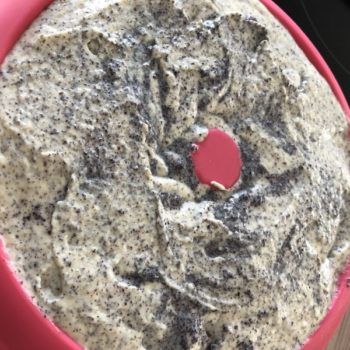 - Den Teig in die Guglhupfform füllen. Den Rest der Mohnfülle drauf geben und mit einer Gabel unterziehen - ergibt eine schöne Struktur im Teig! Mit dem Teig ist die Form "gut" gefüllt! Passt aber noch - siehe Fotos!