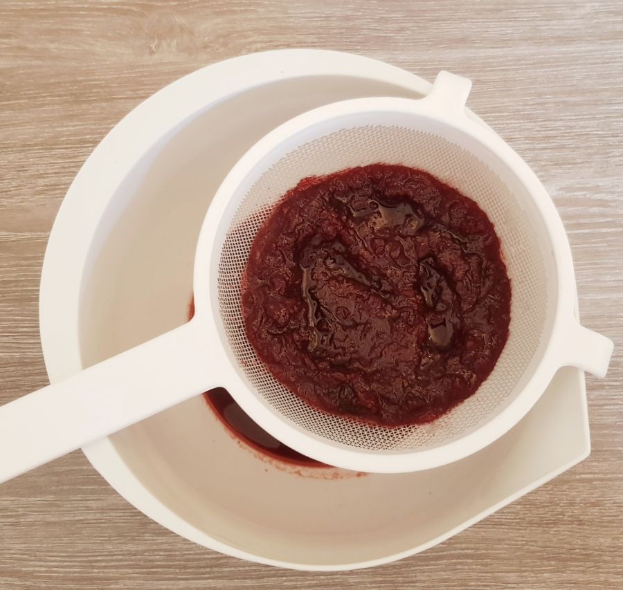 • Nach dem Ruhen wieder in einen Topf leeren, Zitronensaft und das restliche Wasser hinzufügen und aufkochen. Danach 2x durch ein Sieb streichen und in Flaschen abfüllen