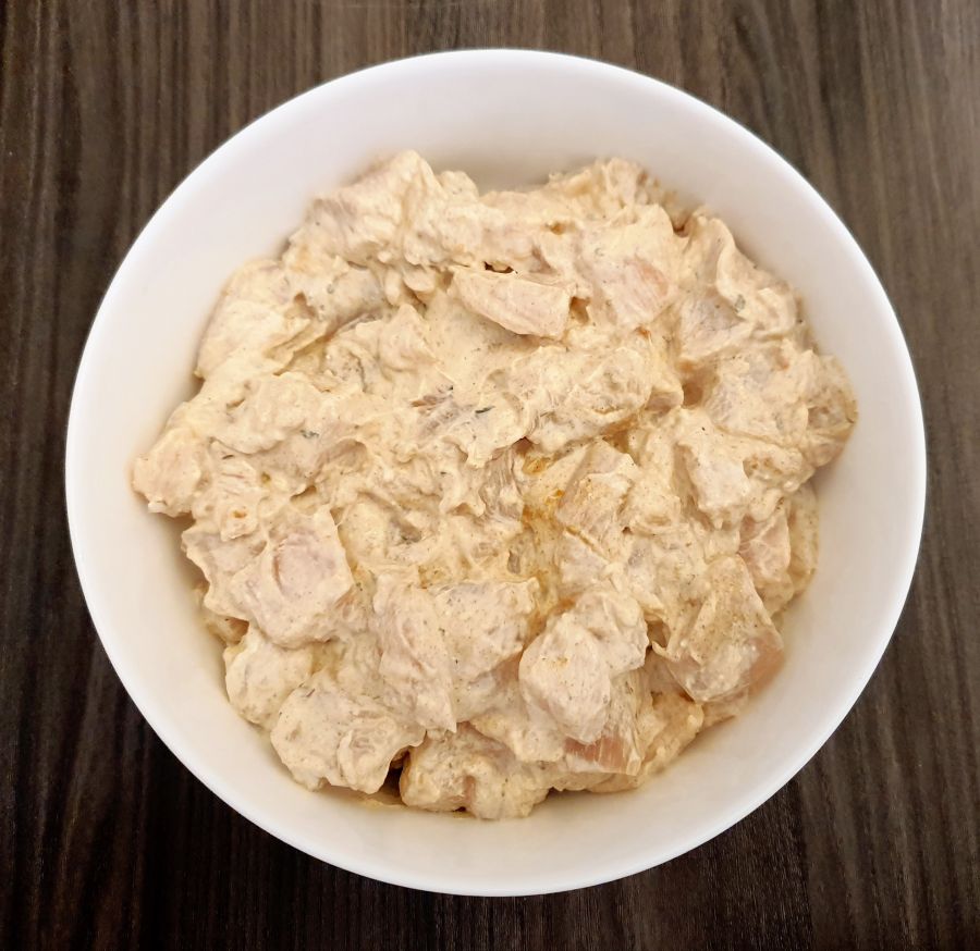 - Hühnerbrust in Würfel schneiden. Joghurt mit Zitronensaft, Öl, Karamelltraum und Gewürze miteinander vermengen und das Huhn in der Marinade wälzen und gut vermengen. Mit Frischhaltefolie abdecken und mindestens 2h im Kühlschrank ziehen lassen. Ich machs immer am Vortag und lass es 24 h ziehen.