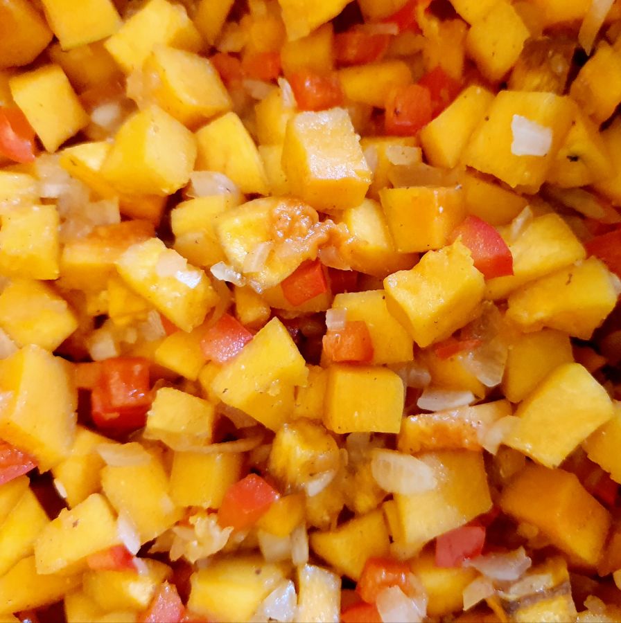 - Kürbis in Würfel schneiden. Zwiebel und Paprika klein würfeln. Ghee und Karamelltraum in einem Topf schmelzen und den Kürbis anschmoren. Kurz zur Seite stellen. In einer extra Pfanne Ghee erhitzen. Zwiebel, gepressten Knoblauch und Paprika anbraten, Tomatenmark hinzufügen und nochmal kurz scharf anbraten, zu den Kürbiswürfel hinzufügen. Kürbiswürfel nochmal erhitzen und mit der Rinderbrühe aufgießen, köcheln lassen bis 1/2 der Flüssigkeit verkocht ist.