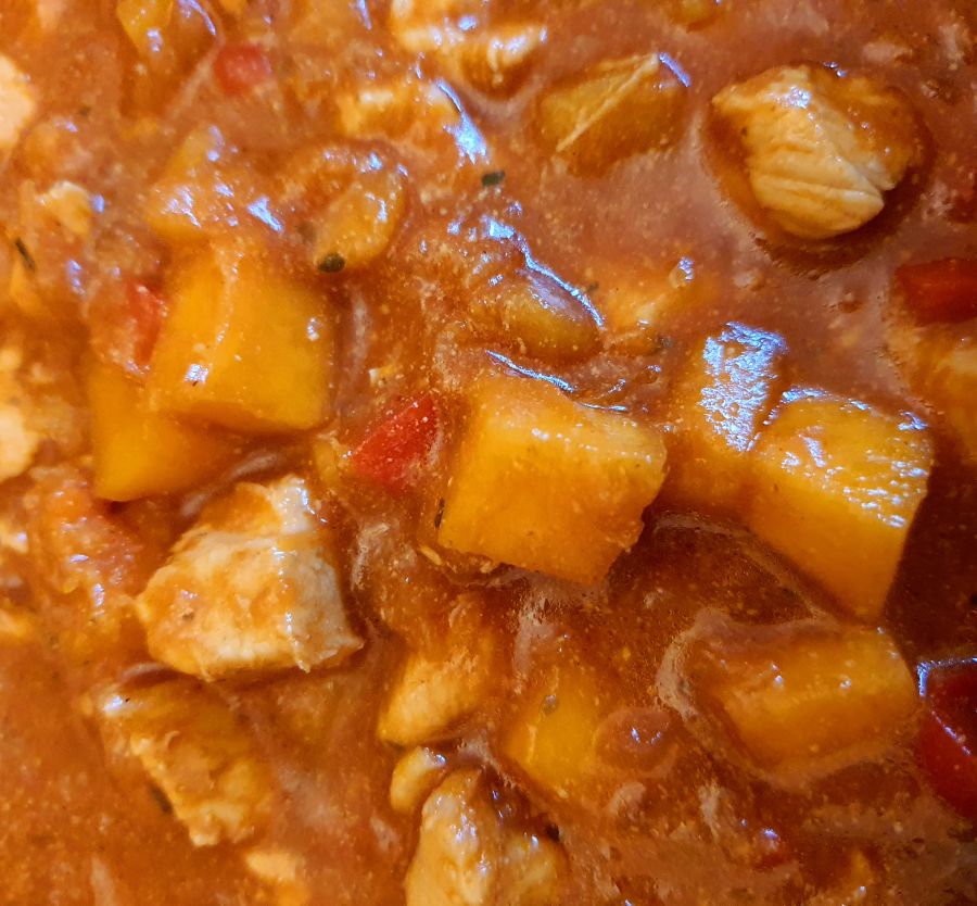 - Huhn in den Topf mit dem Kürbis, passierten Tomaten und Gewürze hinzufügen. Gut 25 - 30 Minuten mit Deckel köcheln lassen. Zum Abschluss Creme Fraiche und Essig hinzufügen, gut umrühren und eventuell noch nachwürzen und abschmecken.