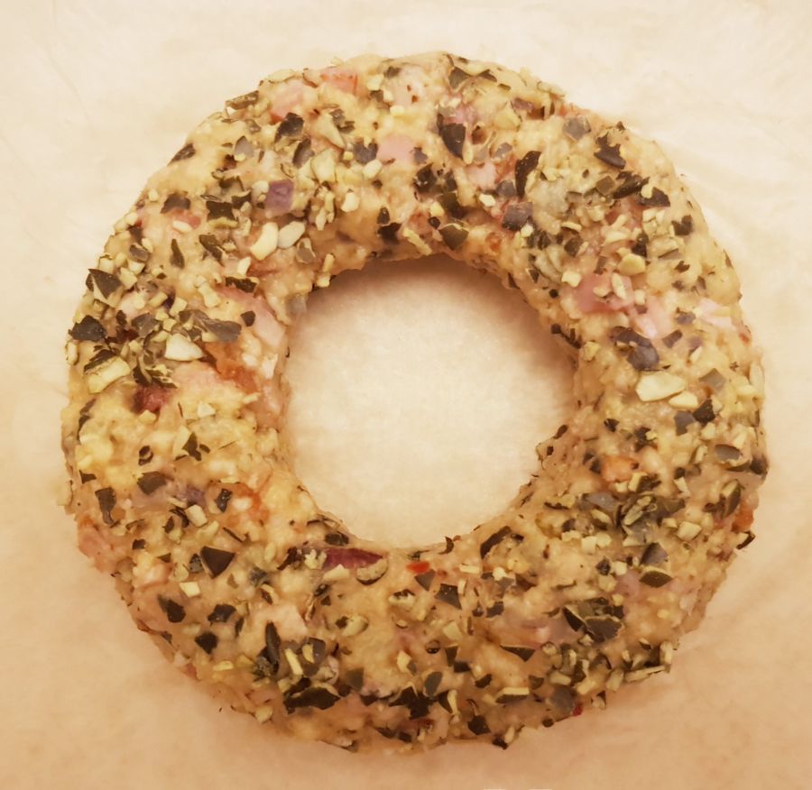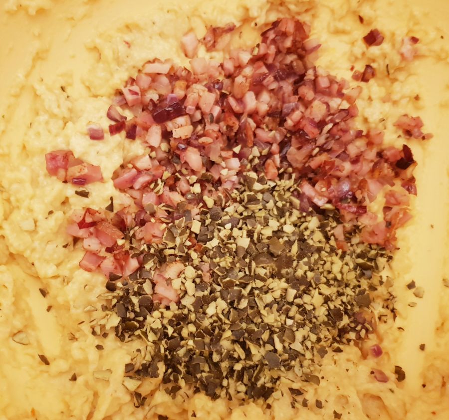 - Kochendes Wasser in eine Rührschüssel gießen und unter ständigem Rühren die Backmischung und Bambusfaser zugeben. 2 Minuten kräftig weiterrühren. Danach Gemüseliebling, Salz und die Eier zugeben. Gut 4 Minuten weiterrühren bis ein gleichmäßiger Teig entsteht. Die Speck/Zwiebelmischung und die Kürbiskerne untermengen und die Masse in einen Spritzsack ohne Tülle füllen.
