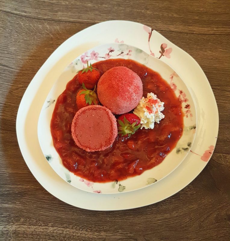 Rezept Mascarpone Erdbeer Knödel mit mit rosa Peffer-Erdbeer-Zitronensauce lowcarb glutenfrei
