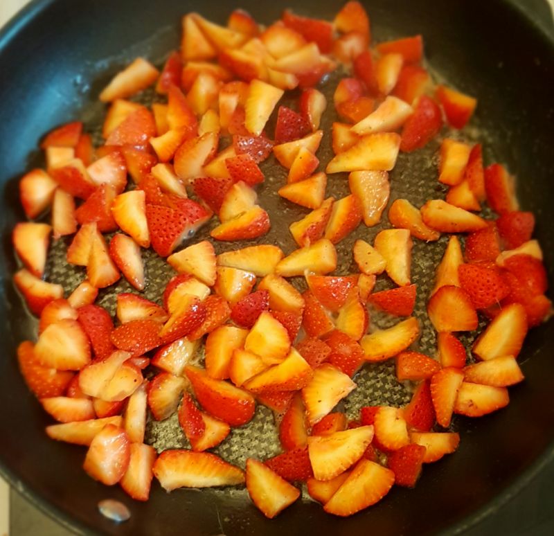 • 500g geschnittene Erdbeeren mit etwas Butter zum leicht Köcheln bringen, den Saft von 1 Zitrone und einen halben TL frisch gemahlen rosa Pfeffer dazu gegeben. Aufkochen lassen. Mit 1 TL Karamelltraum süßen und ein paar Minuten köcheln lassen.