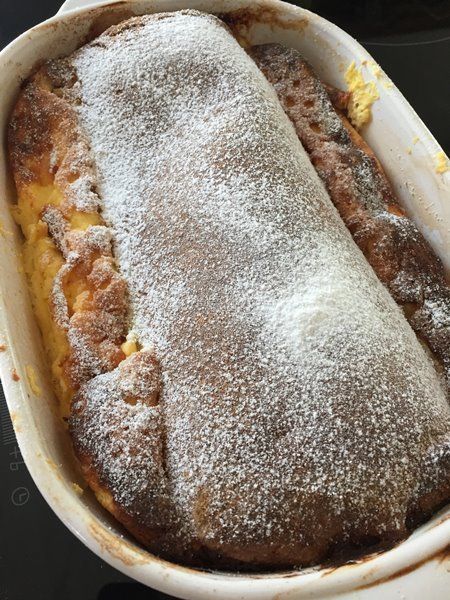 - In der Zwischenzeit die Sahne mit der Creme fraiche, den Eiern, der Süße und der Vanille mit einem Mixer (am Besten Stabmixer) verrühren. Sollte die Eiermilch Klümpchen haben, einfach durch ein Sieb geben. Nach 15 Minuten Backzeit die Eiersahne in die Auflaufform schütten – einfach über den Strudel gießen – und weitere 45 Minuten bei 180 Grad backen.