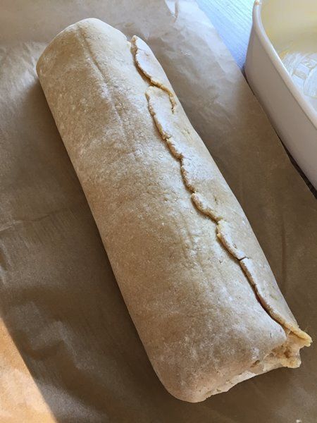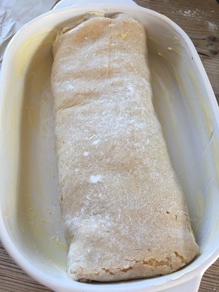 - Mit der Randseite nach unten in eine kleine gebutterte Auflaufform (ca. 26x18cm ) setzen und gut mit geschmolzener Butter bestreichen. TIPP: Am besten mit dem zuvor zum Ausrollen benutzten Backpapier in die Form heben.