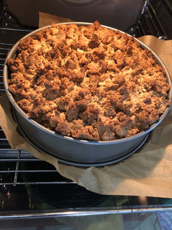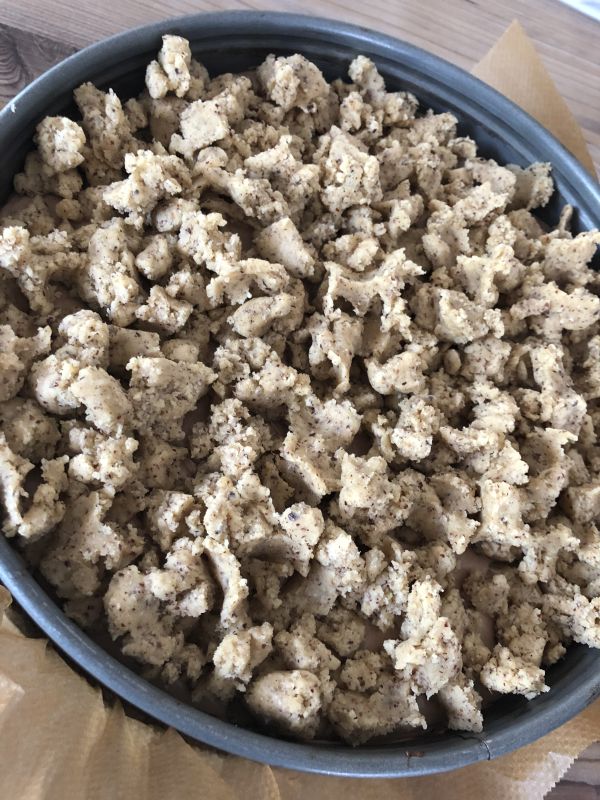 • Mit den Händen die Streusel in der gewünschten Größe auf der Füllung verteilen. Anmerkung: ich habe richtig viel Streuselteig gemacht, damit auch was drauf ist - wer weniger Streusel will, kommt auch mit der Hälfte der Menge aus!