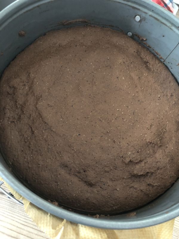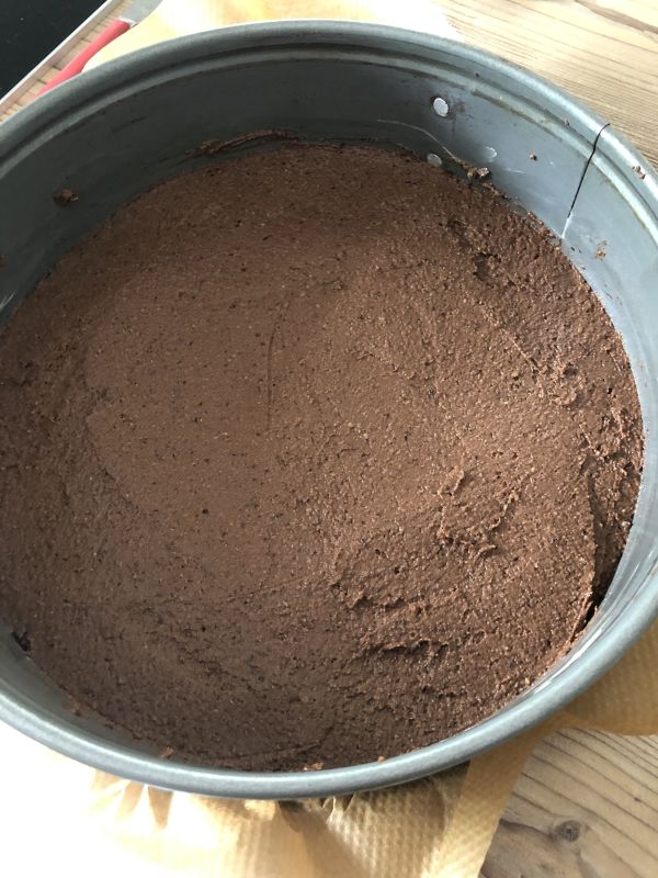 • Den Teig in die vorbereitete Form drücken ohne einen Rand hochzuziehen. Den Boden im Ofen etwa 15 Minuten backen bis er leicht fest aussieht. Den Boden dann kurz aus dem Ofen nehmen und inkl. der Form auf einen Rost stellen.