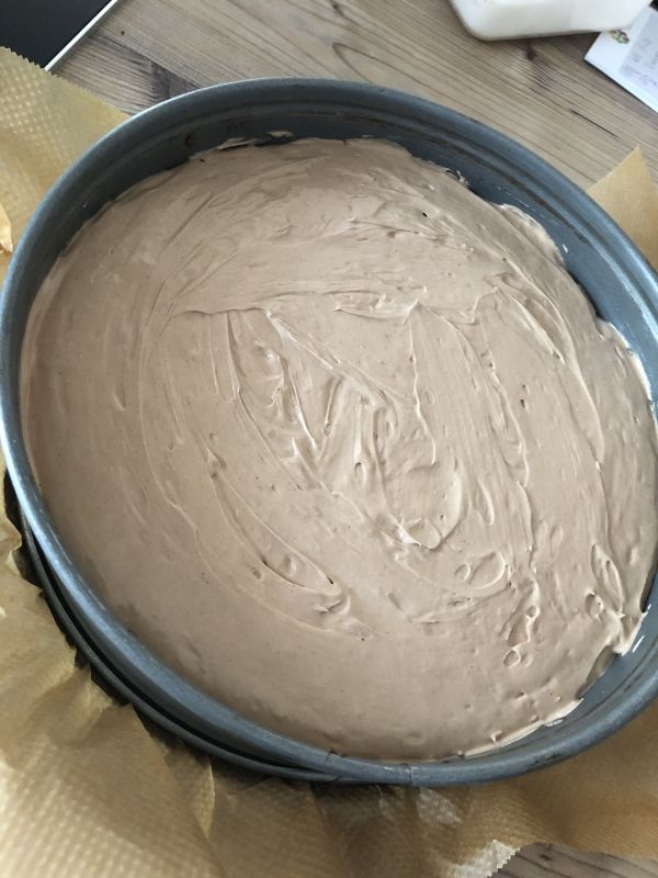 • Die Füllung auf den gebackenen Boden geben, schön verstreichen und etwas rütteln, falls sich Luftblasen in der Füllung befinden.
