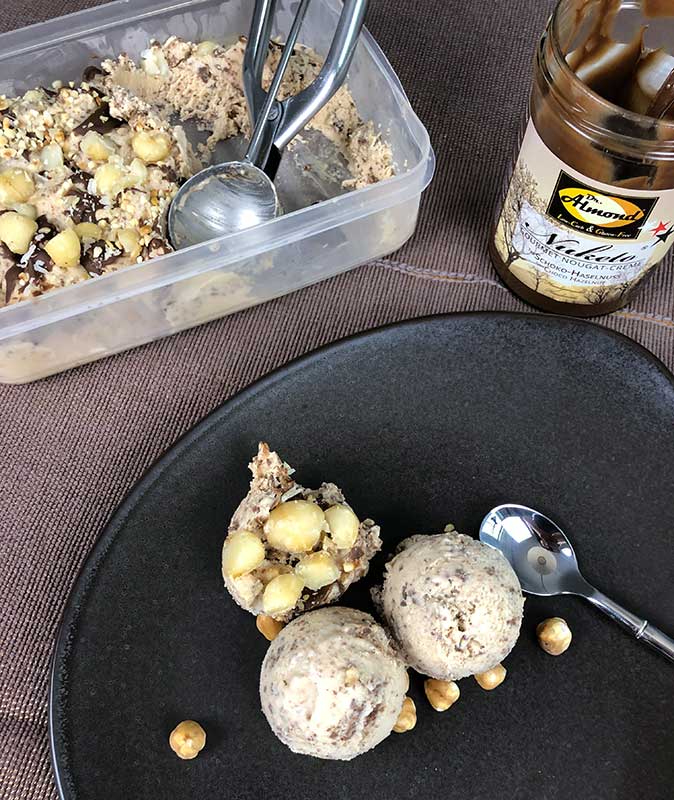 - Anmerkung: (1) In der Grundmasse verwenden wir Haselnussmus, da Nuketo Kokosöl enthält, das sehr fest werden kann und so das Eis nicht mehr richtig cremig ist! (2) Lagerung: Solltet Ihr eine Kühlmöglichkeit zwischen 6 und 10 Grad Minus haben, kann das Eis IMMER wunderbar portioniert werden. Habt Ihr das nicht, das durchgefrorene Eis einfach 30 Minuten früher in den Kühlschrank geben.
