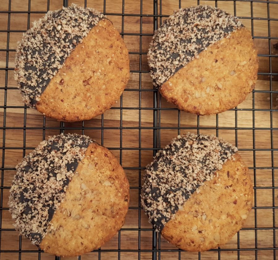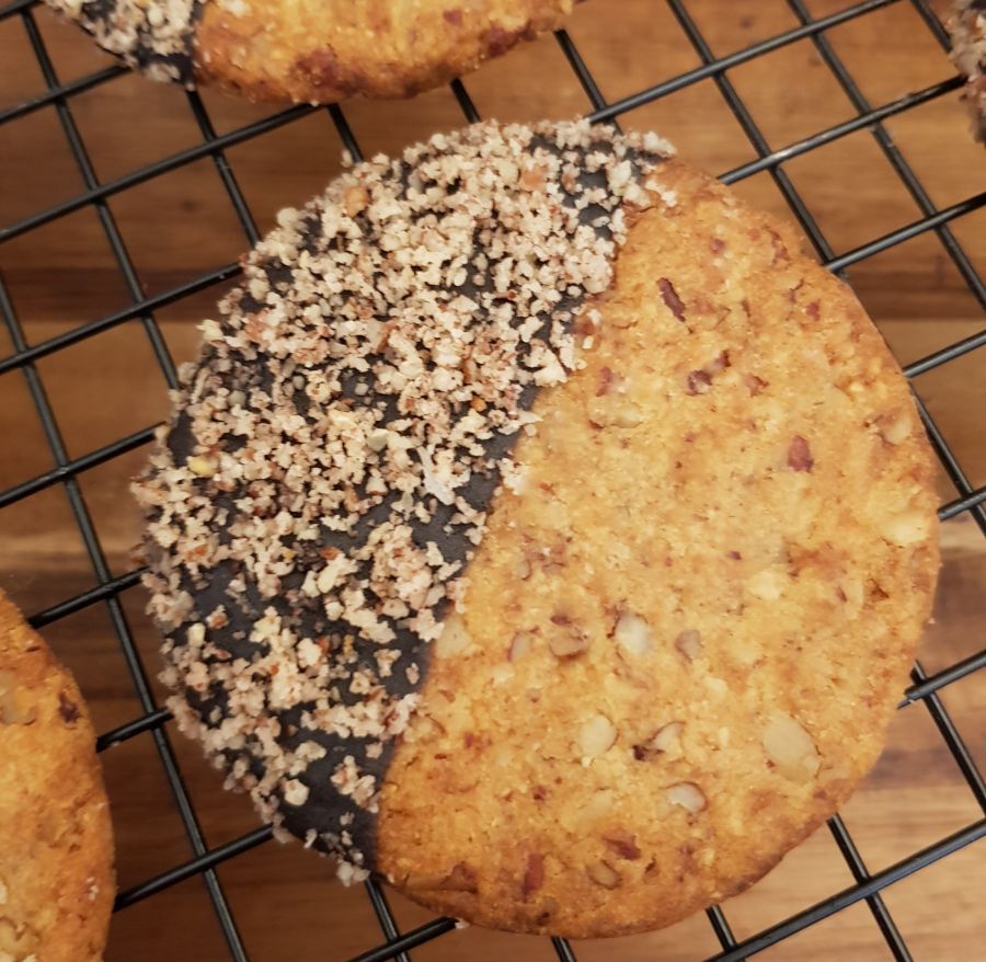 - Schokoladenzauber schmelzen. Cookies zur Hälfte in Schokozauber tauchen und mit gemahlenen Pekannüssen bestreuen.