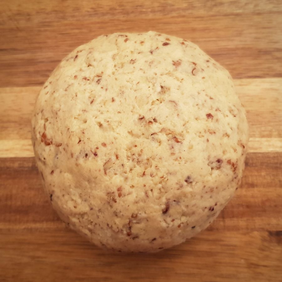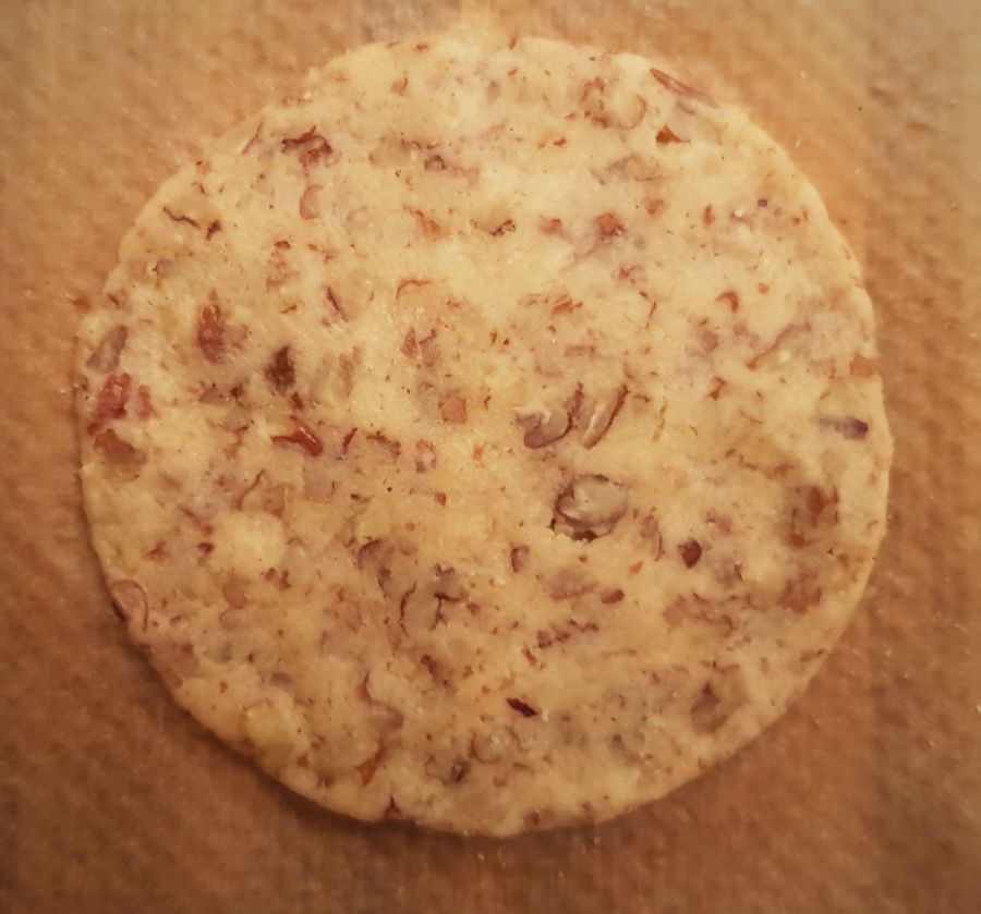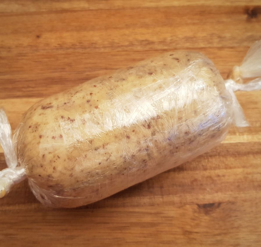 - Alle Zutaten zu einem Teig verarbeiten. Den Teig zu einer Rolle formen, in Folie eindrehen und für 2h im Kühlschrank ruhen lassen.