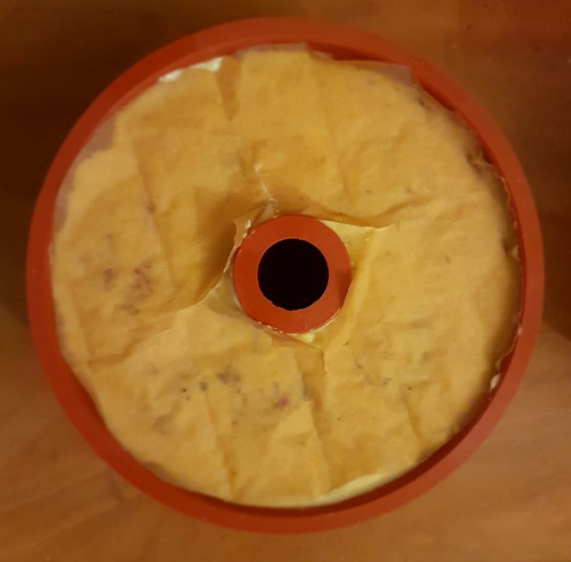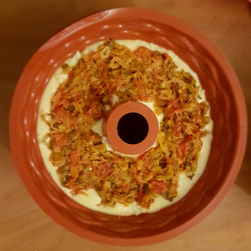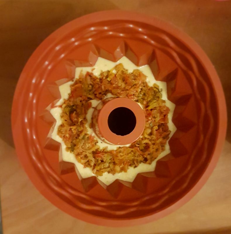 - In eine Gugelhupfform (am Besten eignet sich Silikon) etwas vom Teig einfüllen und die Tomatenfülle mit einem Löffel auf den Teig setzen, mit etwas gerieben Mozarella bestreuen.