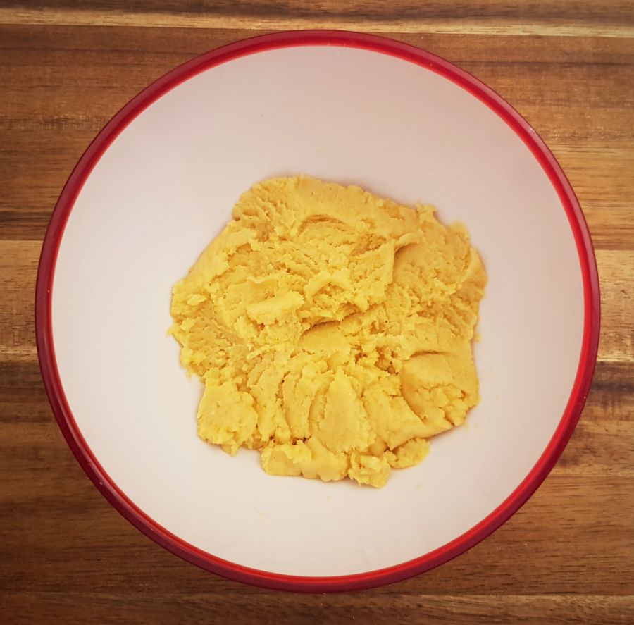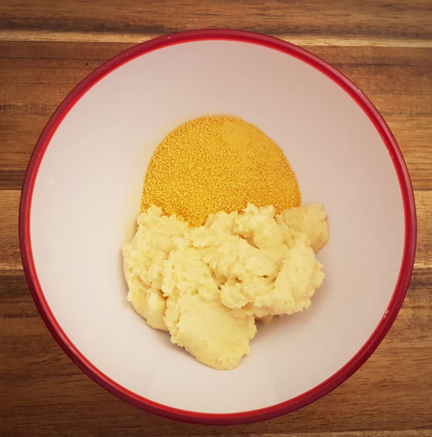 - Schokoladenzauber mit Butter schmelzen, in eine Schüssel füllen, mit Mandelstaub, Vanilletraum und Fruchtpulver Mango zu einer glatten Masse vermengen.