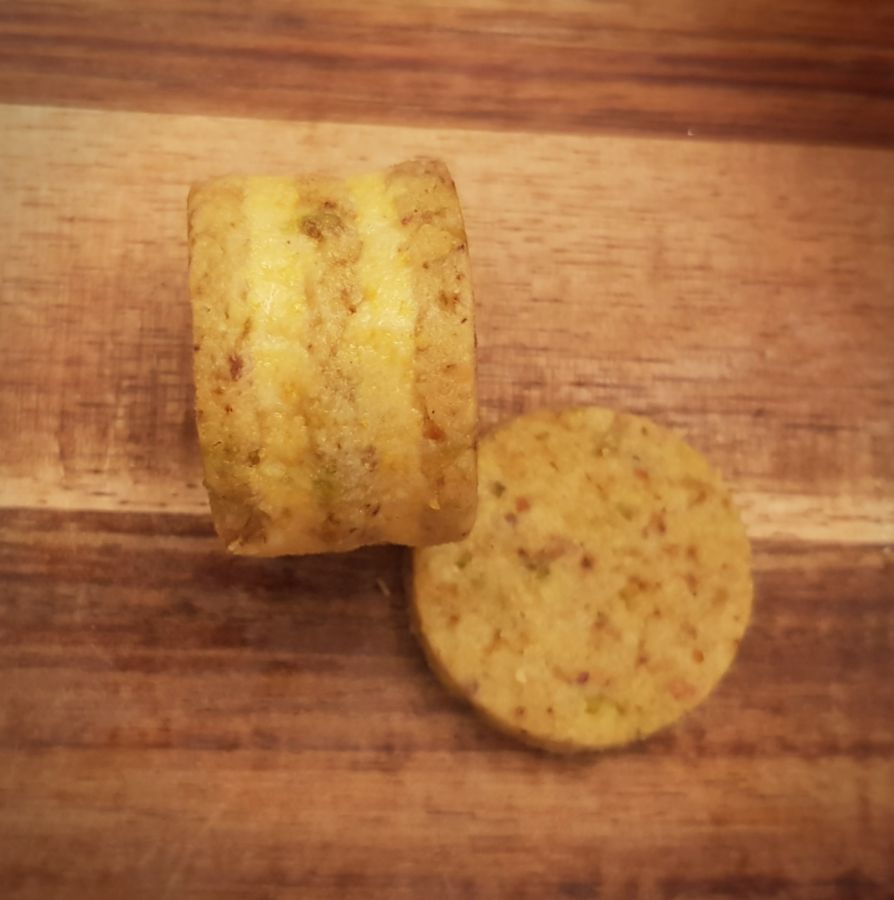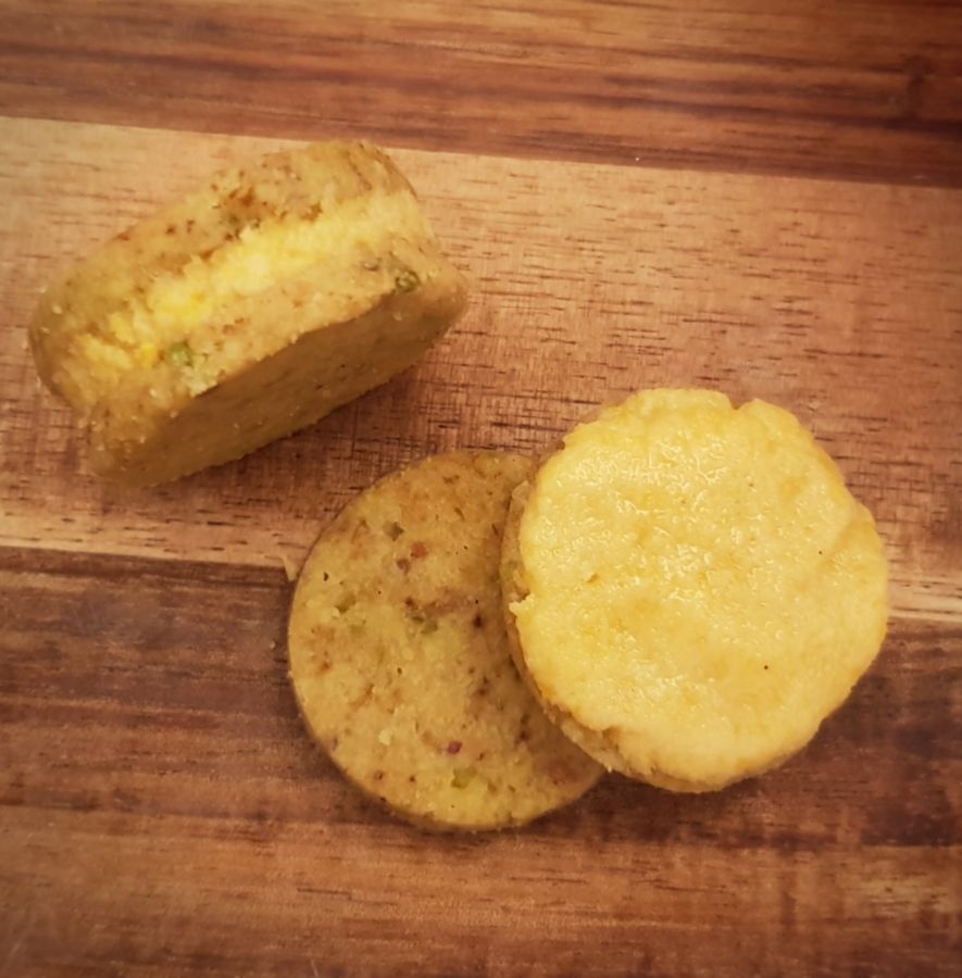 - Kekse mit Mangofüllung bestreichen und 3 Cookies gleichmäßig zusammensetzen. Den Rand mit ganz wenig weicher Butter benetzen und in den gemahlenen Pistazien wälzen.