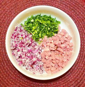 - Schinken, Salami, Zwiebel, Paprika in kleine Würfel schneiden. Basilikum, Petersilie fein hacken.