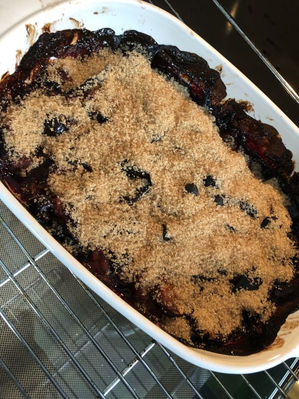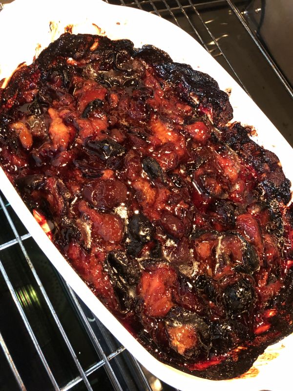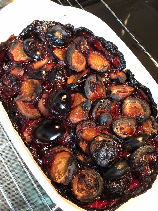 - Backofen auf 180 Grad vorheizen. Die Zwetschgen OHNE Umrühren ca. 100 Minuten einkochen. Bei einer größeren Menge an Früchten ruhig länger einkochen lassen. Die Zwetschgen verfärben sich und der Saft kocht ein.