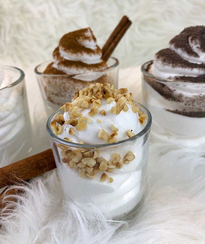 - Ihr könnt nun den Fluff in Gläser abfüllen und nach belieben dekorieren: Kokosflocken, Kakao, Nüsse, Schokolade, Früchte und vieles mehr!