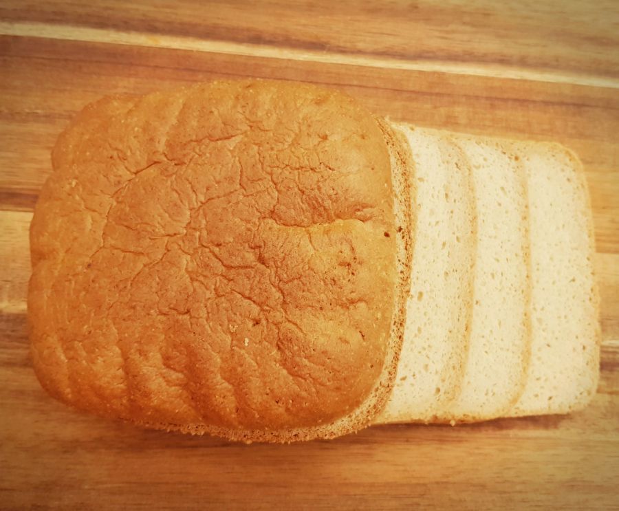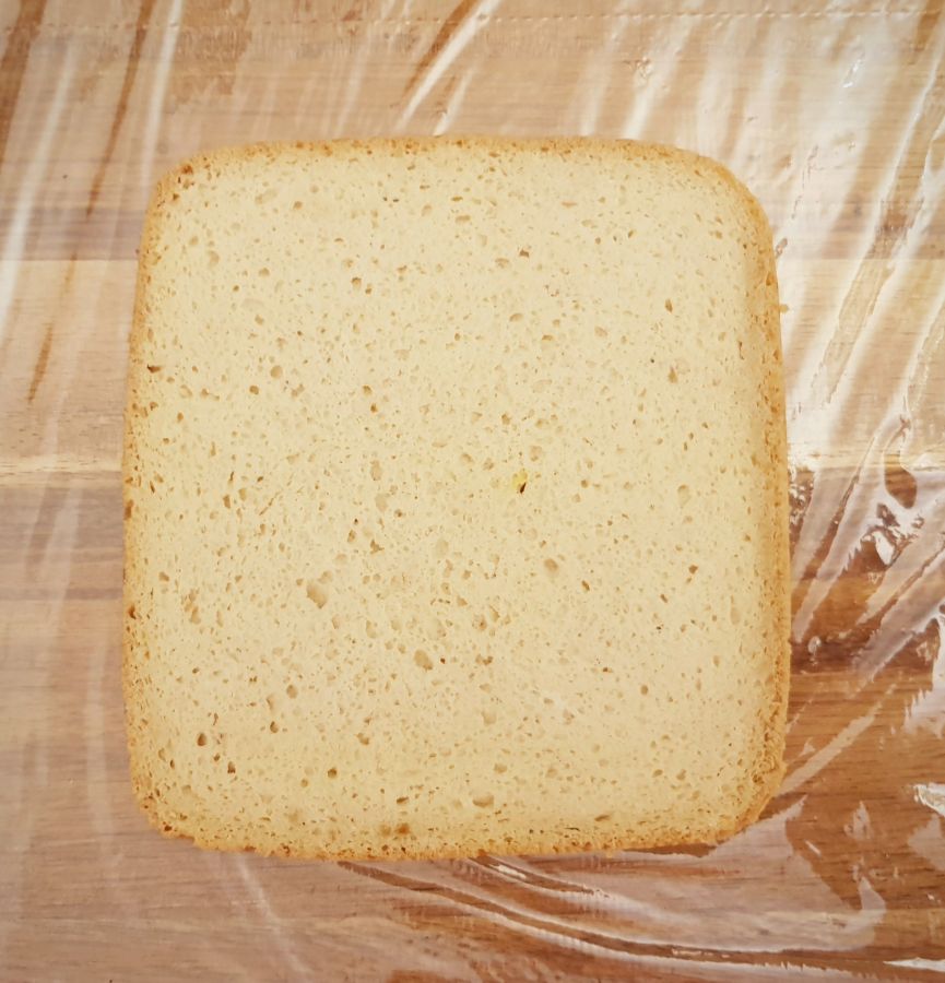 - Nach dem Auskühlen, das Brioche mit der Brotschneidemaschine in 0,5 cm Scheiben schneiden. Ich hab 5 Scheiben geschnitten. Rest bleibt zum Essen übrig. (Gewicht der 5 Scheiben ohne Rinde: 150g - für Nährwerte verwendet)
