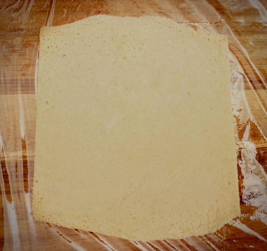 - Die Rinde (Krume) dünn wegschneiden. Auf einem Schneidbrett Klarsichtfolie auslegen und die Scheibe mit dem Nudelholz dünn ausrollen.