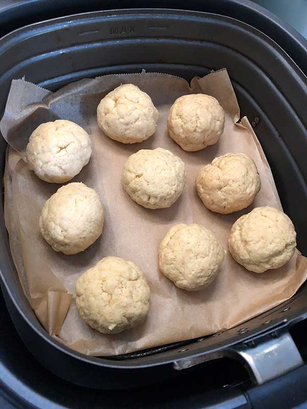 - In den Korb des Airfryer - wir verwenden diesen hier (KLICK) - Backpapier legen und die Bälle darauf verteilen. Bei 150 Grad 40 Minuten backen (Vorheizen NICHT nötig). Zwischendurch einmal wenden.