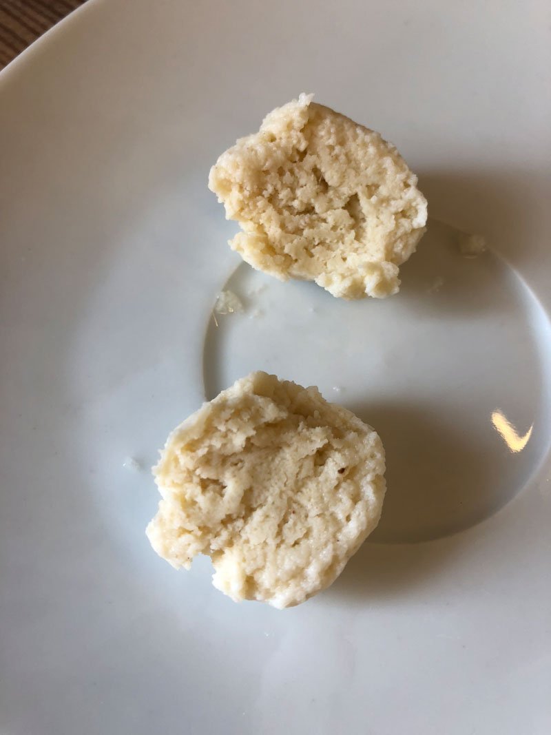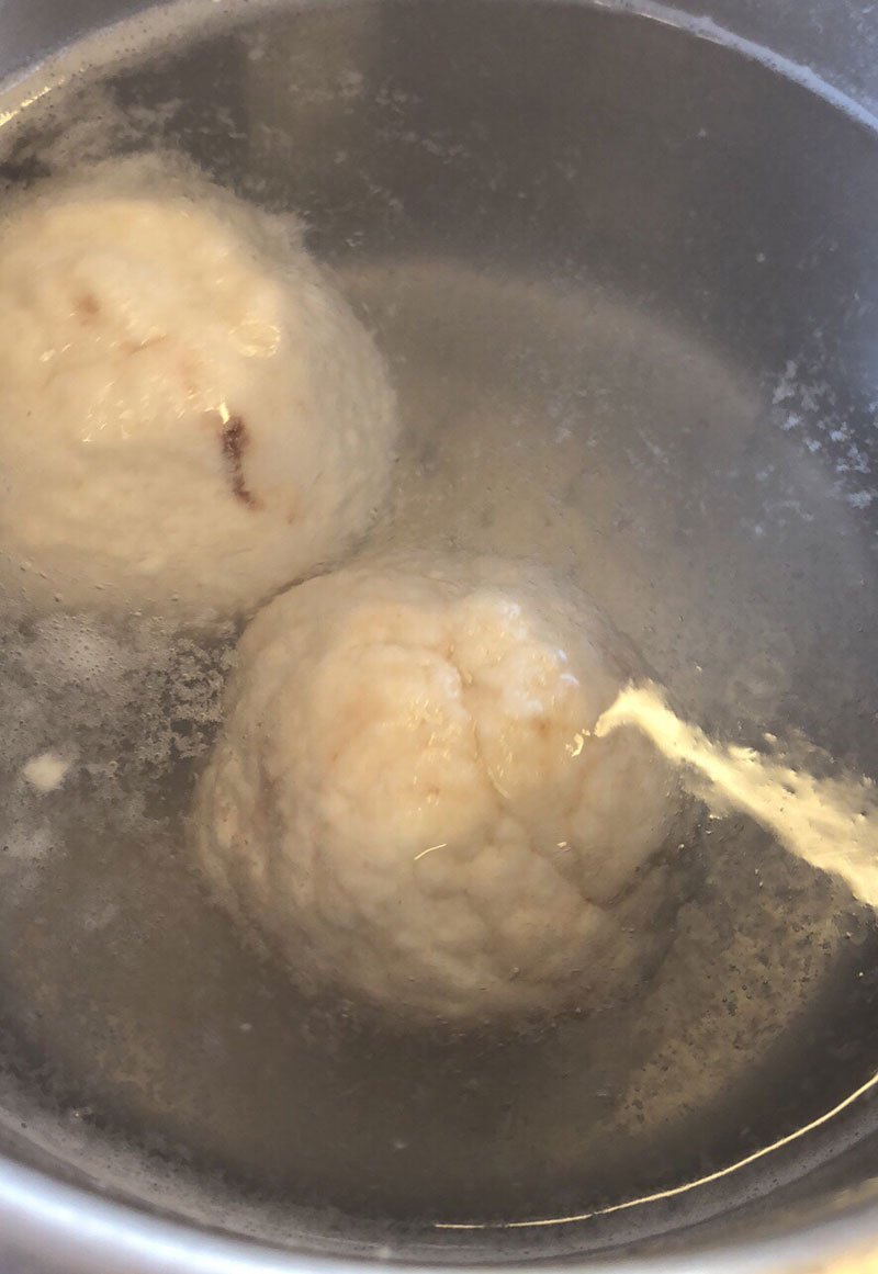 - ACHTUNG: Solltet Ihr L-Eier oder andere Quarksorten verwenden, kann es sein, dass Ihr noch ca. 10g Zitrusfaser nachgeben müsst. Macht einfach einen kleinen Probeknödel ohne Füllung und gebt ihn in leicht siedendes Wasser und lasst ihn durchziehn. Er darf nicht auseinanderfallen - muss kompakt bleiben - siehe Bild unten. Löst sich zuviel Teig, einfach noch Zitrusfaser in den Teig geben.