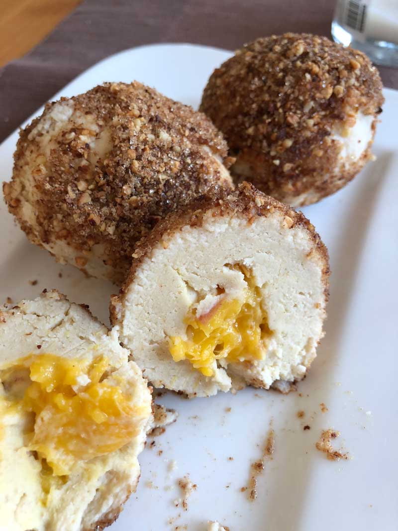 - Als Füllung eignen sich Aprikosen, Zwetschgen, Nougat, Marzipan (Rezeptlink siehe unten) und und und. Ich habe bei meinen Knödeln je ein Stück meiner Karamell-Nougatwürfel (Rezeptlink siehe unten) reingegeben und Pfirsichstücke! Alles möglich!