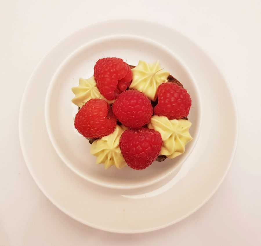 - Die Creme in einen Spritzsack füllen und ca. 25g Creme je Krapfen aufspritzen und mit Himbeeren belegen.