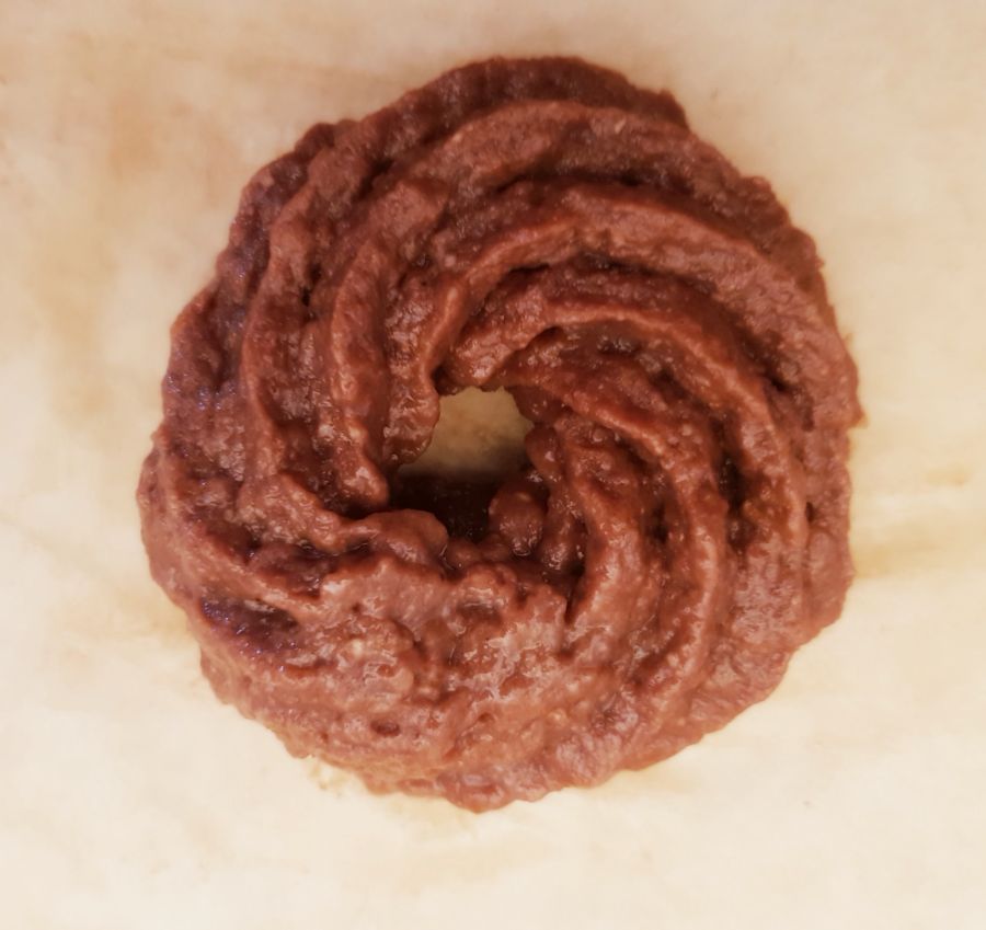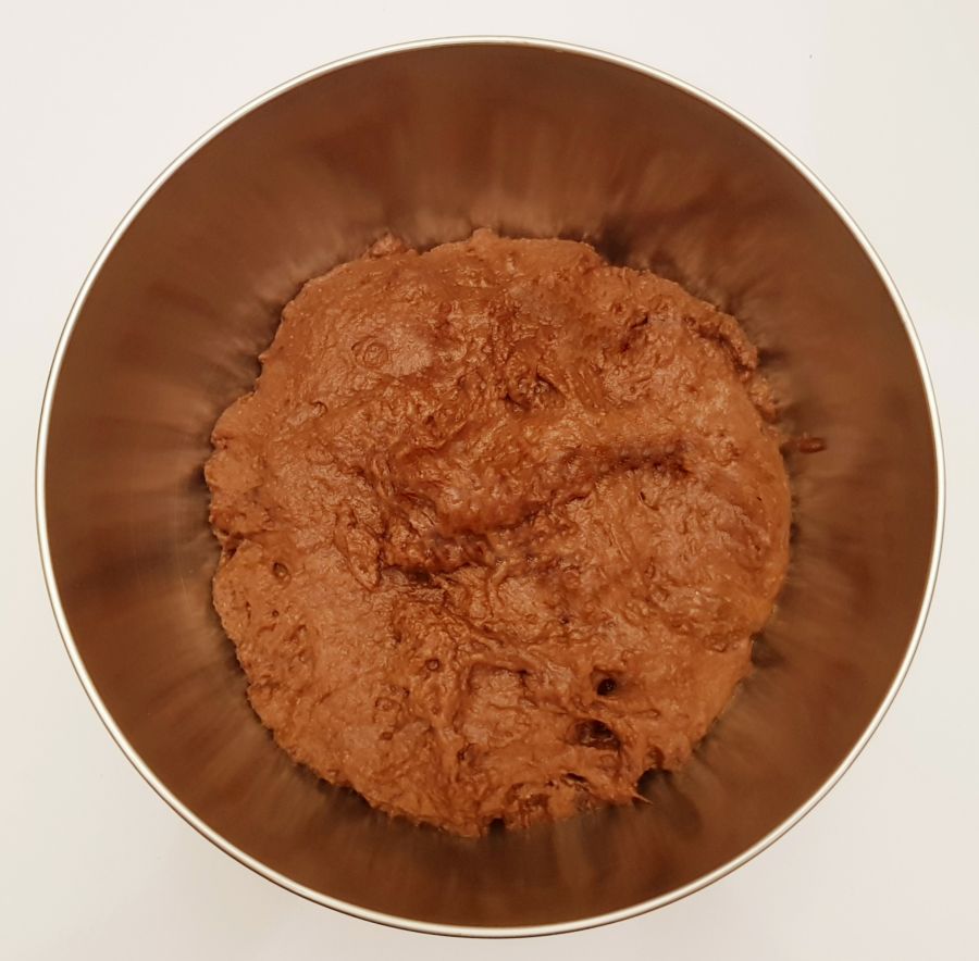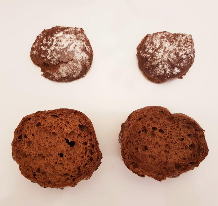 - Kakaopulver und Süße in einer Schüssel miteinander vermischen, das kochende Wasser darauf gießen und kurz durchmixen. Die Brandteigmischung unter ständigem Rühren zugeben und 2 Minuten weiterrühren. Danach die Eier in einer Portion zugeben und 4 Minuten weiterrühren bis ein weicher Teig entsteht.