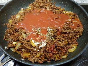 • Die passierten Tomaten zugeben, mit Pizza Pizza! würzen und mit geschlossenem Deckel ca. 20 min bei schwacher Hitze köcheln lassen. In der Zwischenzeit die Spaghetti zubereiten.