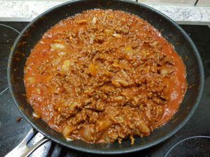 • Wenn die Zwiebeln glasig und das Hackfleisch vollständig durchgebraten ist: mit Rotwein ablöschen und den Senf unterrühren. Ein paar Minuten schmoren lassen, das Tomatenmark zugeben und gut unterrühren.