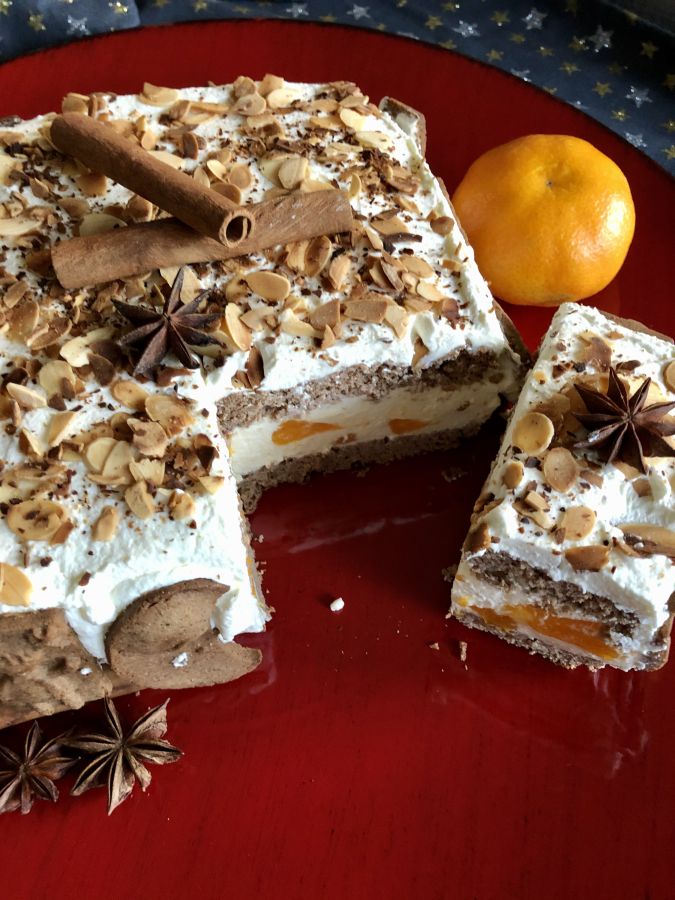 Winterliche Käse-Sahne-Torte mit Spekulatiusbiskuit, Orangenfruchtpulver und Mandarinen! Pro Stück nur 8g Kohlenhydrate!
