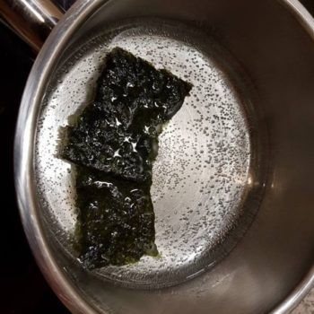 Wasser aufkochen (optional für den Geschmack kurz ein Stück Algenblatt darin schwenken) und den Pasta-Reis und die anderen Zutaten dazugeben. Köcheln lassen bis das Wasser fast vollständig eingezogen ist, dabei immer mal wieder gut umrühren – wird schön klebrig!