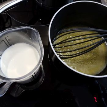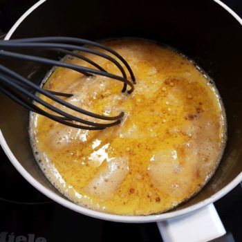 - Die Butter soll am Topfboden eine leichte Bräune zeigen, aber nicht schwarz werden. Sobald ihr erste braune Schlieren erkennen könnt, SOFORT mit der Wasser-Sahne-Mischung ablöschen und vom Herd nehmen.