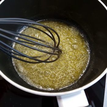 - Die Butter in einem Topf schmelzen und unter ständigem Rühren bei mittlerer Hitze brutzeln lassen. Am Anfang schäumt es noch etwas stärker, da die in dem Butter enthaltene Feuchtigkeit verdampft. Sobald das Schäumen nachlässt, ist Vorsicht angesagt!