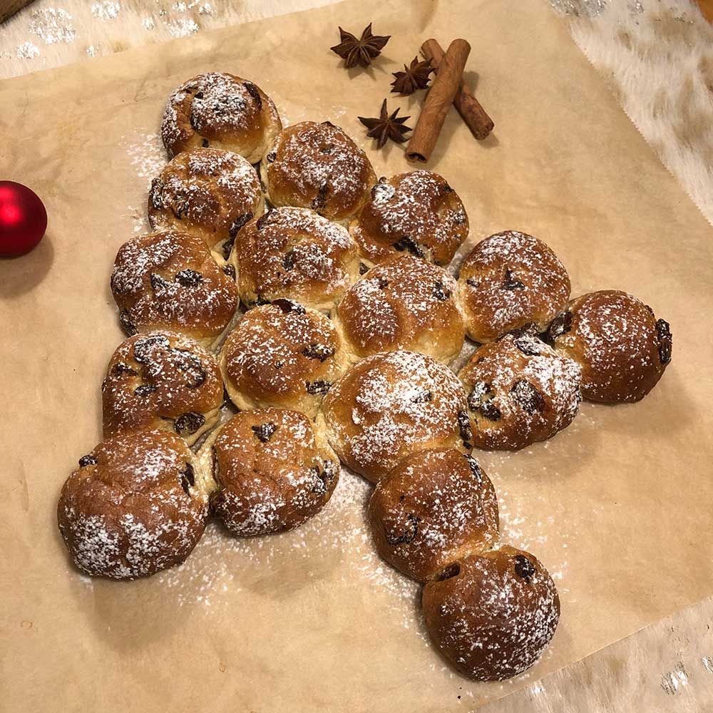 - Aus den Teig 17 Stück Bällchen formen. Die Bällchen auf einem mit Backpapier belegten Blech als Baum anordnen. Zwischen den Bällchen unbedingt 1 cm Abstand lassen - wächst beim Backen zusammen. Leicht mit Bambusfaser besieben für die Schneeoptik.