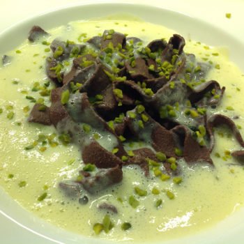 Vorschlag von uns: Schokoladennudeln mit Vanillesoße und Pistazien.