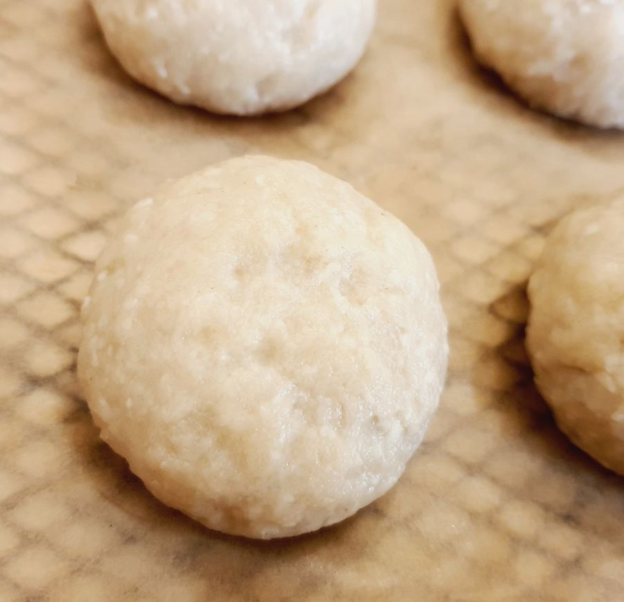 Aus dem Teig kleine Bälle zu je 40g drehen und auf ein Gitter, das mit Backpapier ausgelegt ist, setzen. So entstehen 16 Bälle.