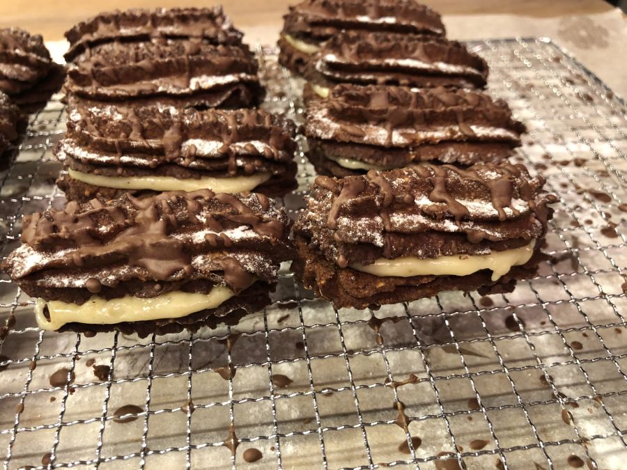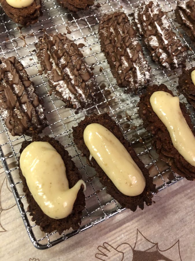 Mit einem Spritzbeutel die Hälfte der Stangen damit bespritzen und zusammensetzen.