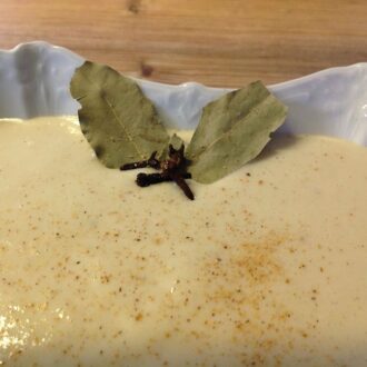 500ml Milch aufkochen und die Zwiebel mit den Gewürzen zugeben. Zugedeckt min. 30 Minuten ziehen lassen. Dann die Zwiebel und die Gewürze wieder entfernen.