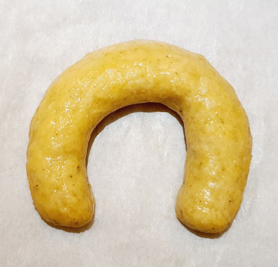 Die Kugel flach drücken, aufrollen und gleichmäßige Stränge drehen. Kipferl daraus formen.