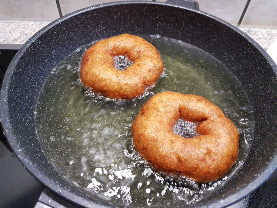 Packungsanleitung der Mini-Berliner mit Hefe zubereiten. Aus dem Teig 4 - 6 Donuts formen. Das geht besonders einfach, wenn du zunächst die Teigklumpen zu Knödeln formst, diese etwas platt drückst und mit dem Finger ein Loch in die Mitte stichst. Anschließend weitest du das Loch gleichmäßig rundherum aus (s. Photo). Die Teiglinge anschließend 45 Minuten offen ruhen lassen.