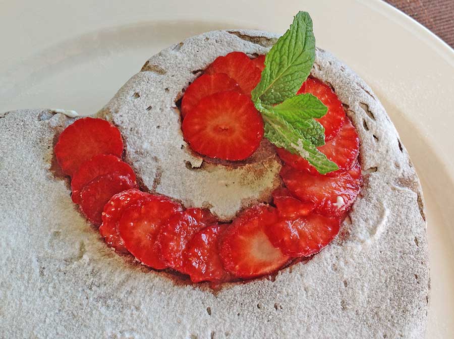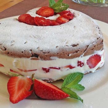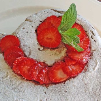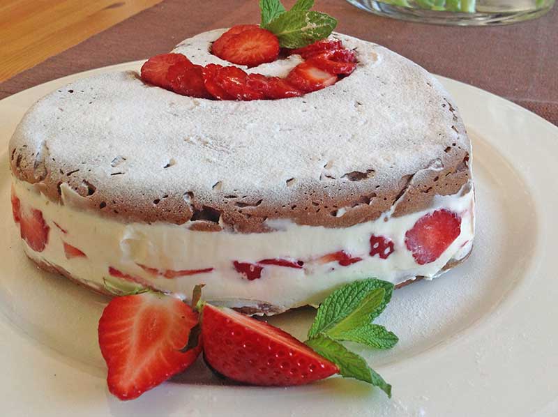 Die Torte nun vorsichtig auf eine Platte stürzen. Mit Vanilletraum oder Pudererythrit bestäuben und die Erdbeeren in Scheibchen schneiden und in die EInbuchtungen oben füllen. Den Rand der Torte glatt streichen. Nach Belieben dekorieren.