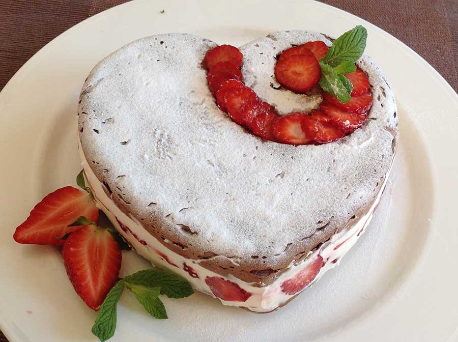 Den Boden aus der Form stürzen und auskühlen lassen. Mit einem scharfen Messer in 2 Böden schneiden und den oberen Boden wieder in die Herzform legen, so dass das Muster unten ist!