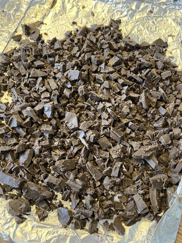 Die Schokoladenplatte mit einem Messer in kleine Stücke zerhacken und wieder im Kühlschrank kalt stellen.