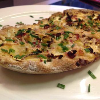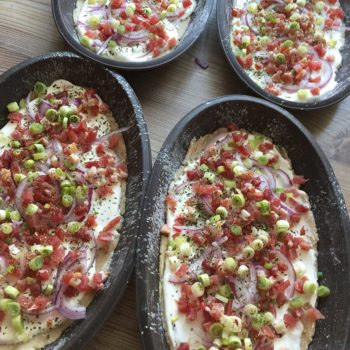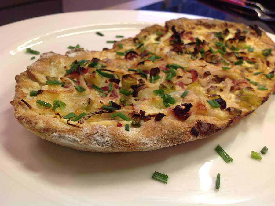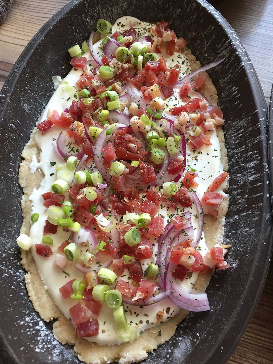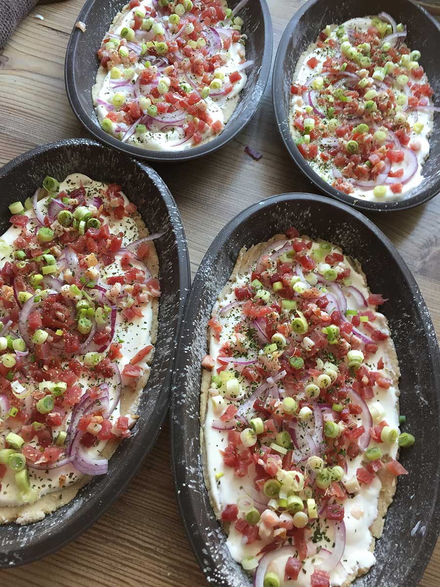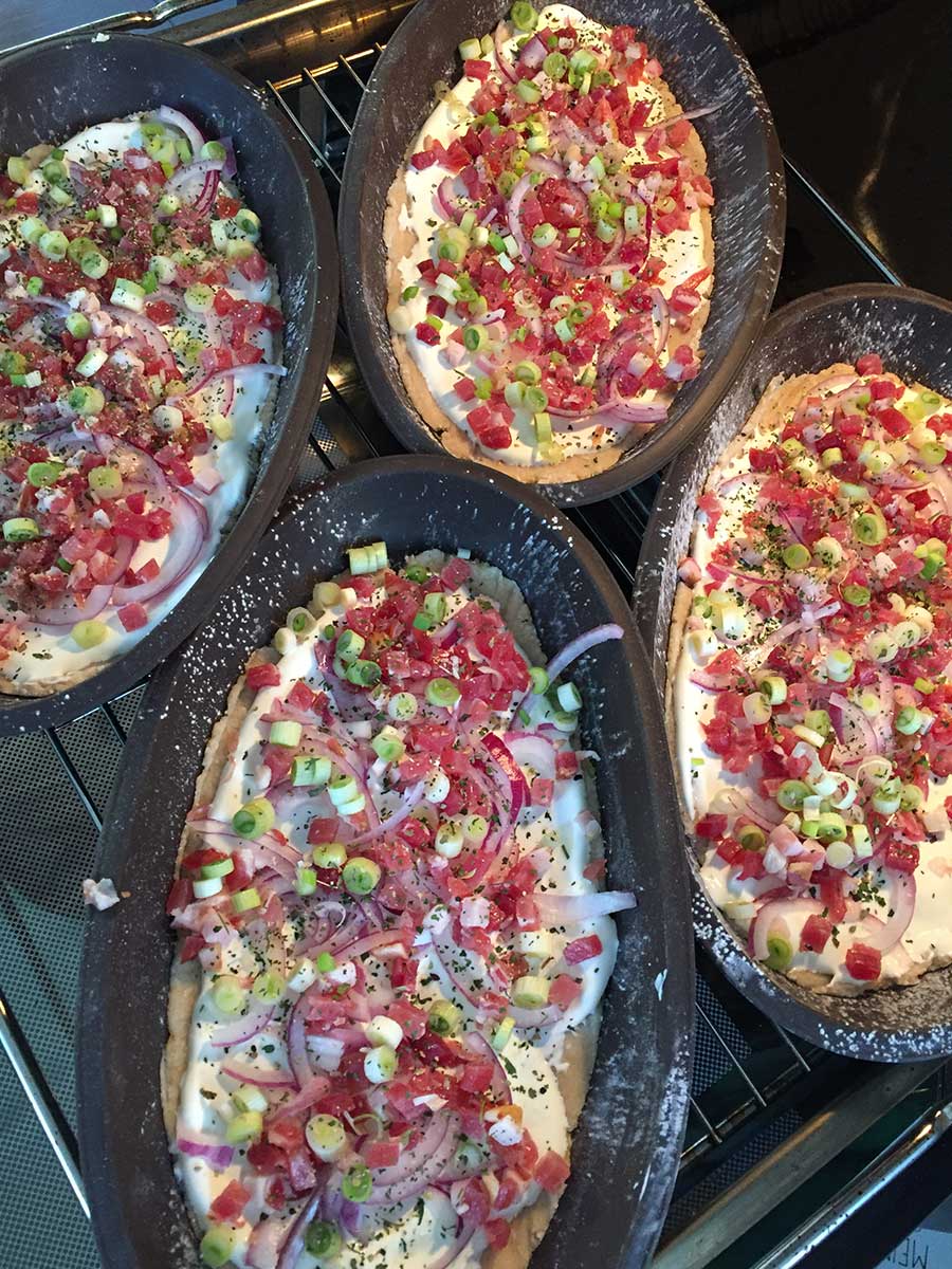 Den Boden mit Saurer Sahne bestreichen (vorher nach Belieben salzen). Zwiebeln, Schinkenwürfel und Frühlingszwiebeln darauf verteilen. Am Schluss mit "Bruchetta & Tomate" bestreuen!